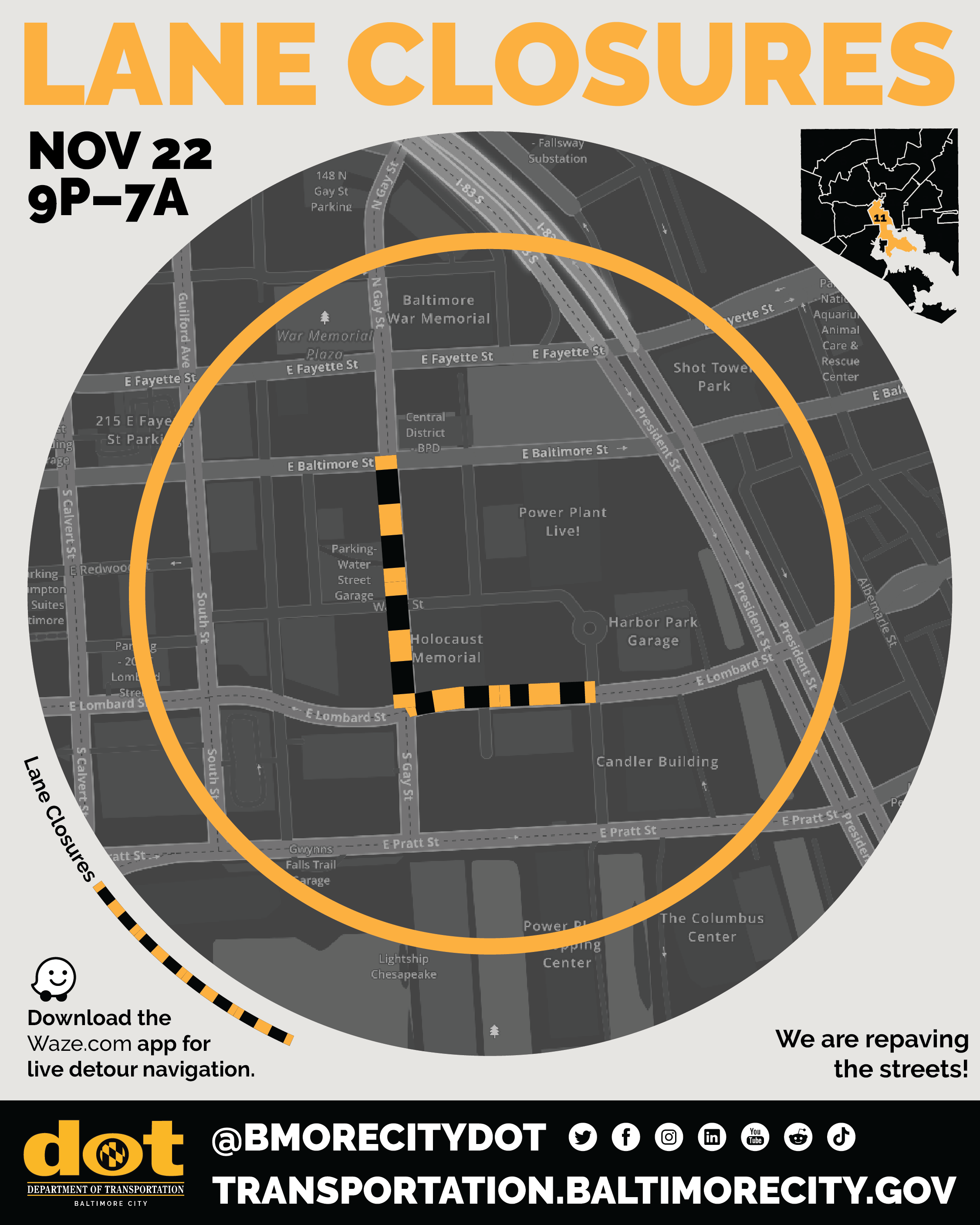 π§ Lane Closures Tomorrow Night π§ This work starts tomorrow, so if you travel through this area, you should plan ahead and expect delays. π Location: E Lombard St from Market Place to Gay St N Gay St from Lombard to Baltimore St π Date: November 22 β° Time: 9p to 7a Crews will be milling and pa...Read more