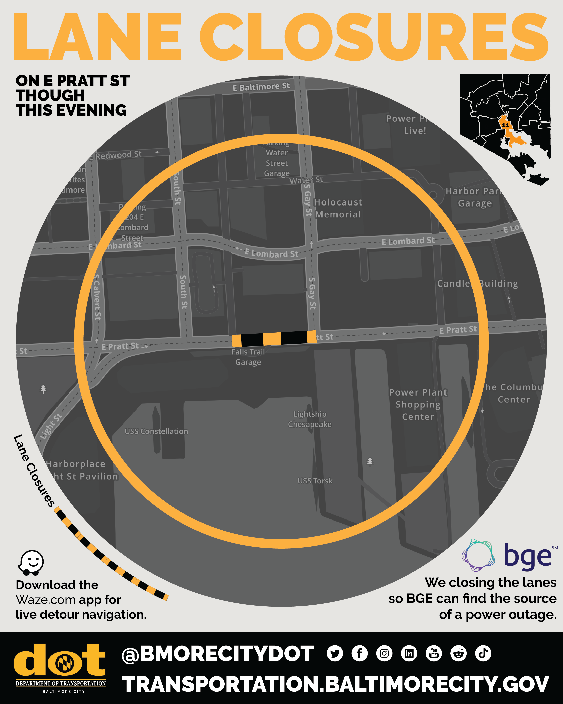 :construction: Lane closures on E Pratt St continue through this evening BGE crews are still working to track down the source of a power outage, so weβve closed lanes on E Pratt St near Gay St to give them safe access to the underground infrastructure. If youβre driving through the area, please slo...Read more