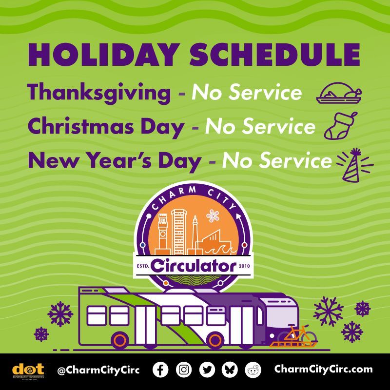As the holidays approach, please note dates when the Circulator will not be in operation: Thanksgiving Day (11/27) Christmas Day (12/25) New Year's Day (1/1) Plan ahead, stay cozy, and enjoy the holiday season! π @CharmCityCirc