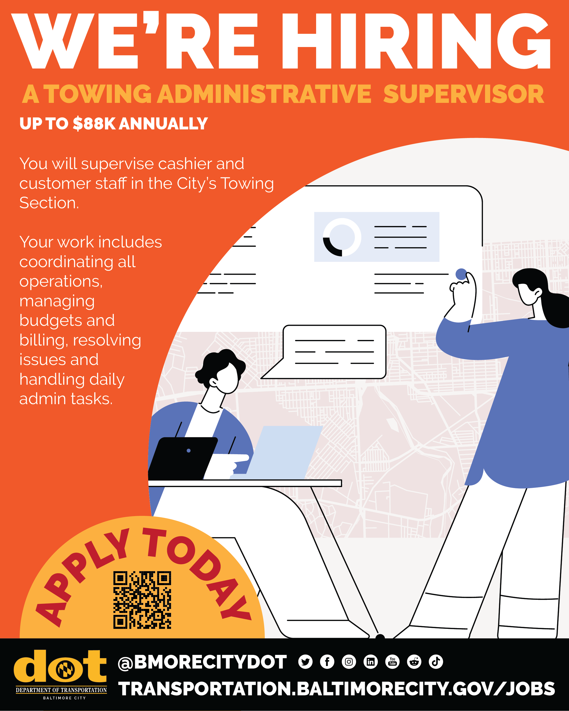 We're hiring a Towing Administrative Supervisor! Up to $88k Annually Oversee daily operations at Baltimore Cityβs Towing Section by supervising the cashier and customer service staff. Use your administrative, budgeting, and financial reporting skills to keep the impound process running smoothly an...Read more