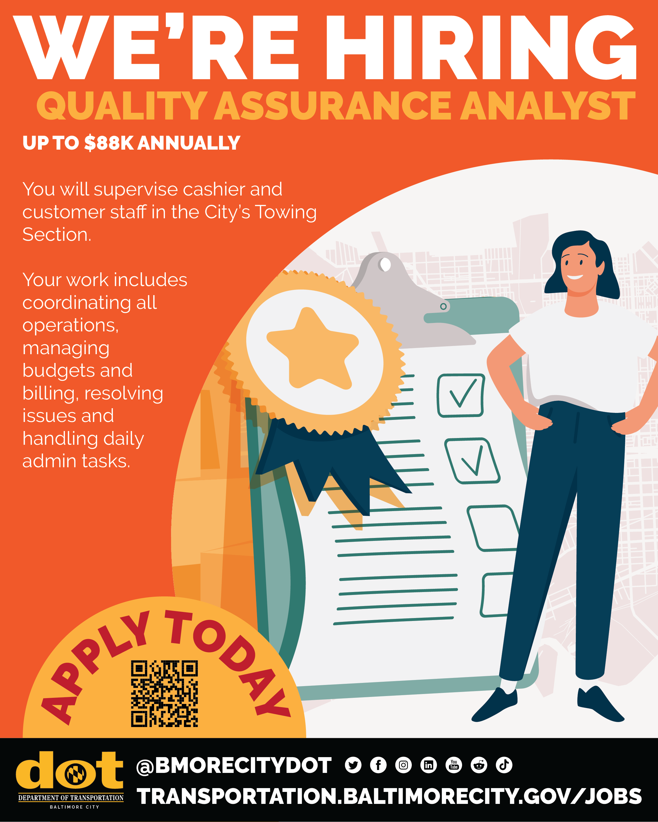 We're hiring a Quality Assurance Analyst! Up to $84k Annually Support the accuracy and integrity of Baltimoreβs transportation programs by reviewing documentation, validating records, and ensuring compliance with City policies. Use your analytical skills to identify errors, evaluate processes, a...Read more