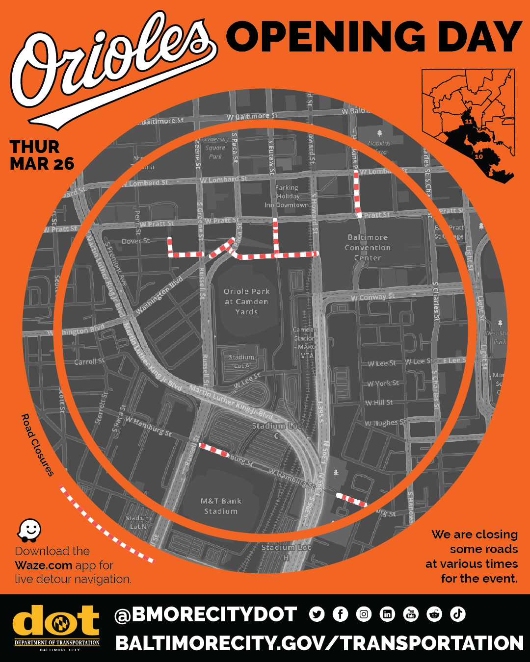 βΎ Opening Day is almost here! The Baltimore Orioles return to Oriole Park at Camden Yards this Thursday at 3:05 p.m., and heavy pedestrian and vehicle traffic is expected downtown. π§ Road closures and parking restrictions will be in place. π Fans driving to the game are encouraged to use commerc...Read more